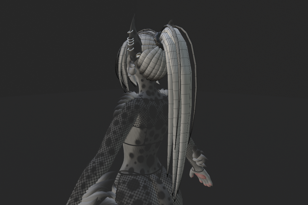Ponytail hair and fishnet shorts and top I made for my Zara model(panties and bra not included). Made using blender, marvelous designer, and substance painter.
